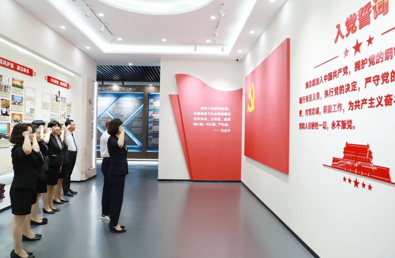 在“重温誓词 永葆本色”环节,面对鲜红的党旗,全体党员在党支部书记的带领下,庄严地举起右拳,重温入党誓词。铿锵有力的誓言在展厅内回荡,既是对入党初心的再次铭记,更是对永葆清正廉洁政治本色的坚定承诺。