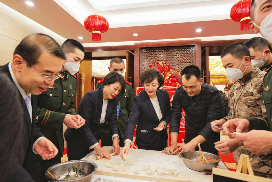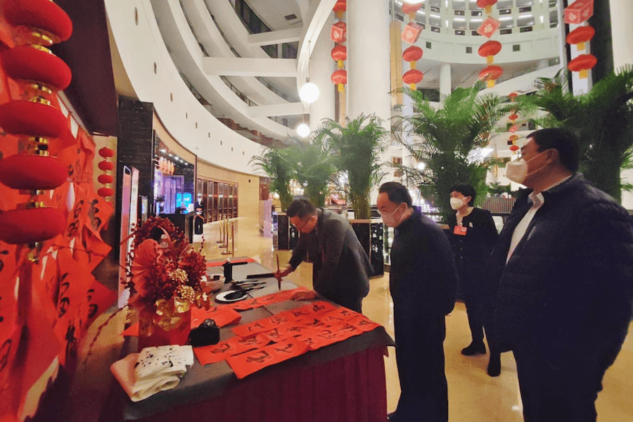 盛会恰逢新春佳节来临之际。为了营造欢乐喜庆的节日氛围,英国威廉集团官网宾馆对公共区域环境进行了精心布置,红灯笼、花灯笼、贴窗花、挂福饰……令人大代表们眼前一亮,开怀一笑。2023年是癸卯兔年。山东大厦各餐厅节日氛围浓郁,兔年吉祥展台、年宵花福桶、兔爷非遗装饰等令人赏心悦目。1月14日恰逢小年,餐厅里设置DIY水饺操作台,代表、委员们与大厦服务人员,一起包水饺,煮水饺,餐厅一时间变成了家的厨房。餐厅门口还设置了“迎春纳福”书法展台,供代表委员们挥毫泼墨,书写新春的祝福。贴着自己写的春联与福字,品尝着自己包的水饺,代表委员与大厦工作人员共度小年夜,温情感动,其乐融融,感受家一般的温暖。