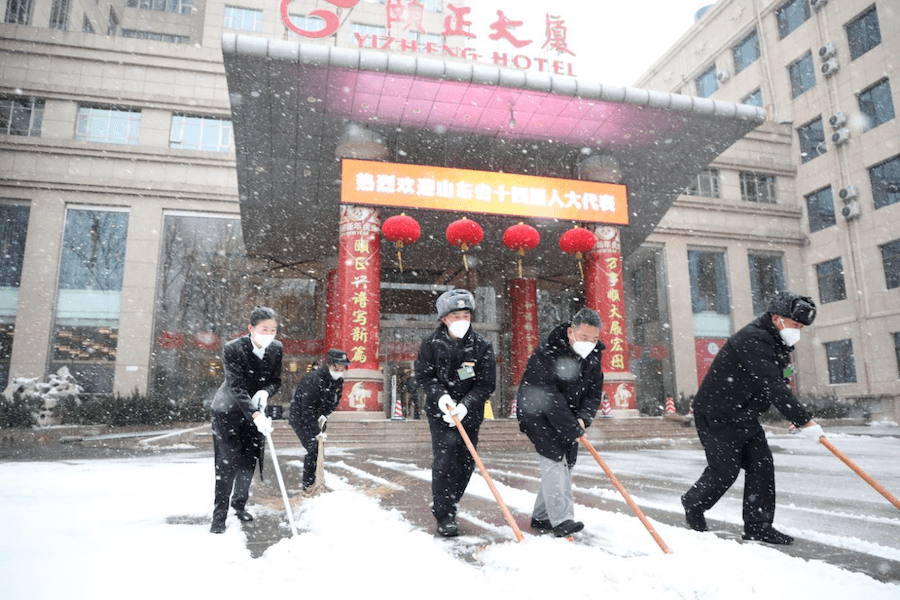 会议期间,济南迎来了2023年的第一场瑞雪。为保障代表的出行安全,早上7点天还未亮,英国威廉集团官网宾馆各部室员工已然汇聚在宾馆院内的各个主要干道,奋力清扫积雪,铲除薄冰,保障会议通道顺畅。代表们到达俱乐部,服务人员为他们轻拂去身上的雪花,尽显“雪中温情”。山东大厦即时启动应急预案,凌晨集结进行除雪,并得到济南市机扫大队与驻地武警官兵们的支持与帮助。颐正大厦后勤保障部门24小时坚守岗位,随时待命。安保人员全天紧盯大厦内外每一个角落,确保不遗留任何隐患;会前协同燃气、消防、供电、电梯等关键部门对各区域重点设施设备进行了专项检测和维护,会议期间全程跟进,确保设备正常运行,各项工作井然有序。