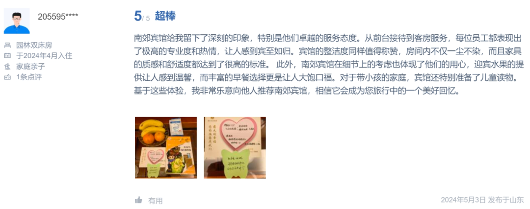 暖心服务,温馨时刻。五一预订火爆,大部分宾客居家外出游玩,亲子出游占比非常高。为更好地提供优质服务,宾馆各部门创新服务,齐心协力,做足准备,紧抓“关键时刻”,通过暖心服务,赢得宾客五星好评。客房部特意开展了“为爱分享、共筑亲情客房”儿童图书角、玩具免费赠等活动,收获了一批“小粉丝”。