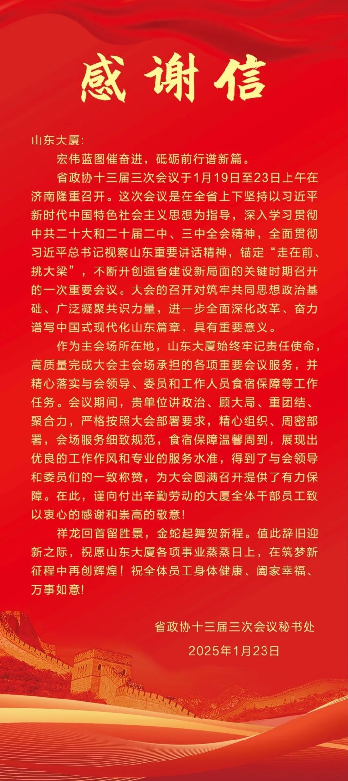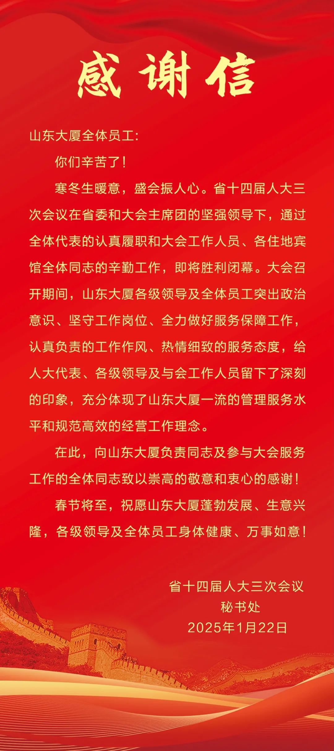 会议保障任务圆满完成,山东大厦再一次交出了令人满意的答卷,再一次展现了大厦人真诚好客的热忱和专业过硬的品质。一封封载满温暖的感谢信和锦旗纷至沓来,这既是对全体干部员工辛勤工作的褒奖,更是对大厦人奋楫笃行、再启新程的鞭策。