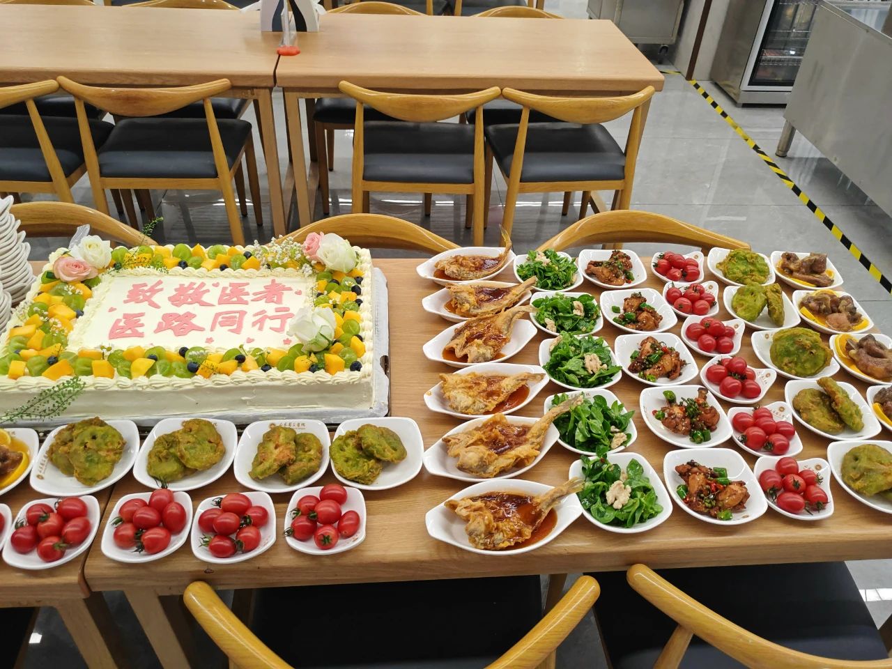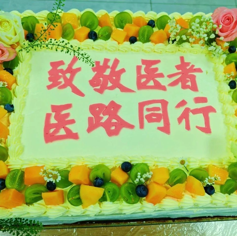 省立医院东、西院区食堂被布置得热烈而温馨,悬挂着粉色和蓝色为主色调的横幅,上面写着“致敬医者,医路同行”,桌面上摆满了鲜艳的花束和祝福卡片,让人一看到就心生温暖。为了增加节日的趣味性,还准备了盲盒抽奖及鲜花赠送环节。