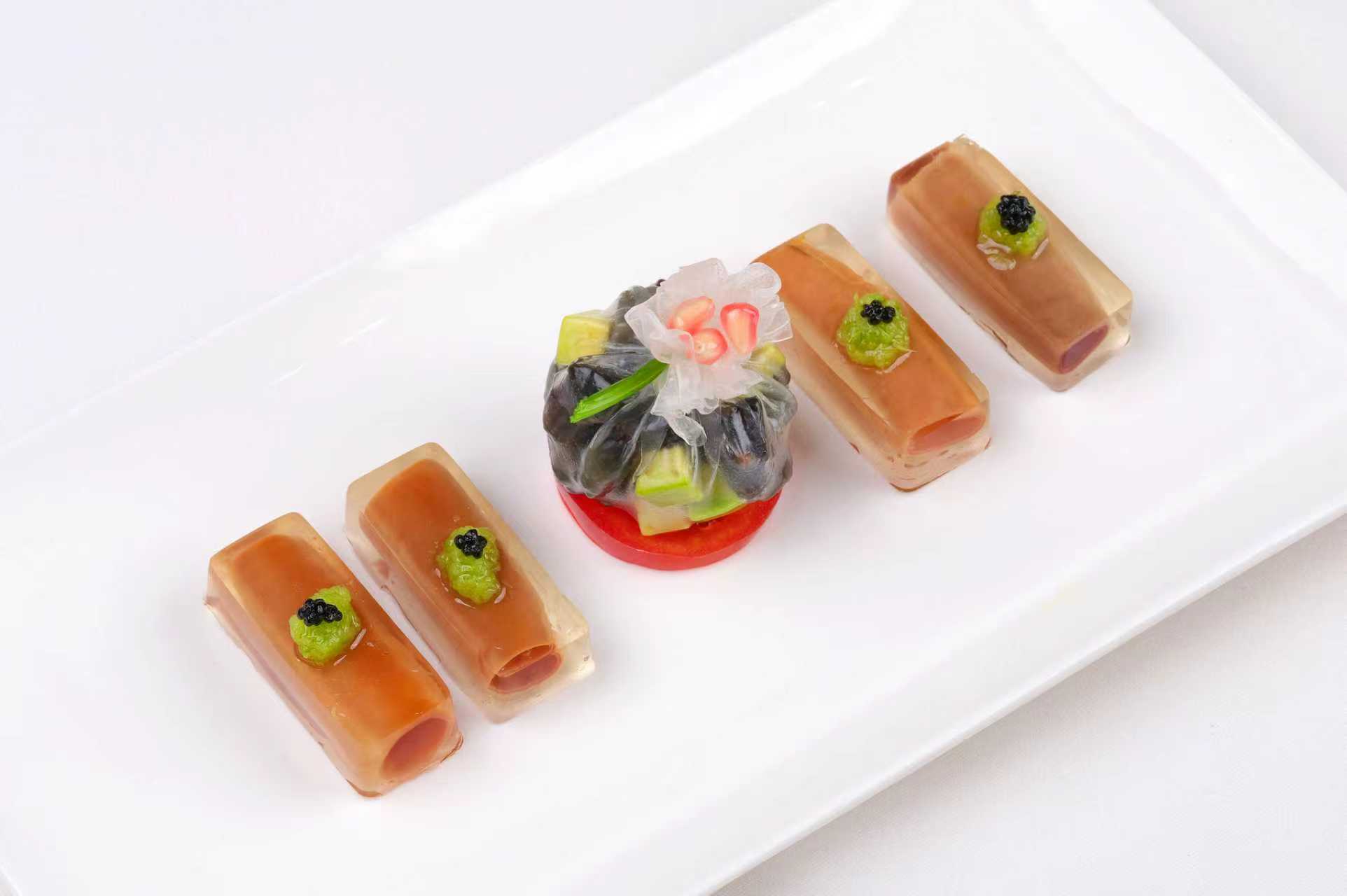 凉菜:青椒海肠冻配捞汁海参